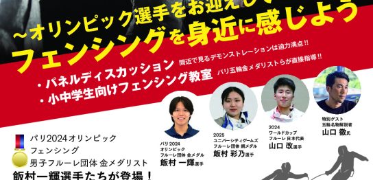 パリ2024オリンピック夏季競技大会フェンシング競技において、男子フルーレ団体金メダルを獲得し、現在も国際的な大会で活躍している飯村一輝選手らを迎えて、パネルディスカッションやデモンストレーションのほか、小中学生向けのフェンシング教室を開催いたします。