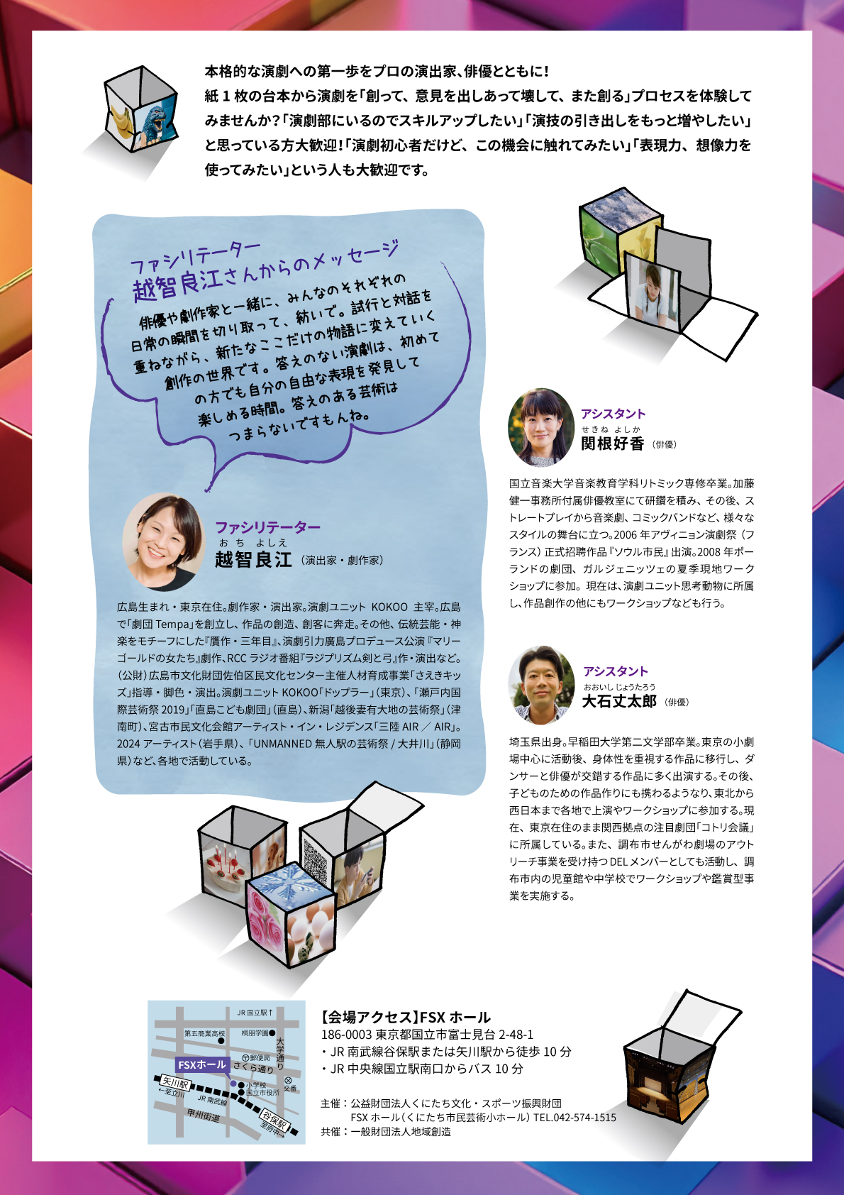ファシリテーター越智良江さんからメッセージ         俳優や劇作家と一緒に、みんなのそれぞれの日常の瞬間を切り取って、紡いで。試行と対話を重ねながら、新たなここだけの物語に変えていく創作の世界です。答えのない演劇は、初めての方でも自分の自由な表現を発見して楽しめる時間。答えのある芸術はつまらないですもんね。