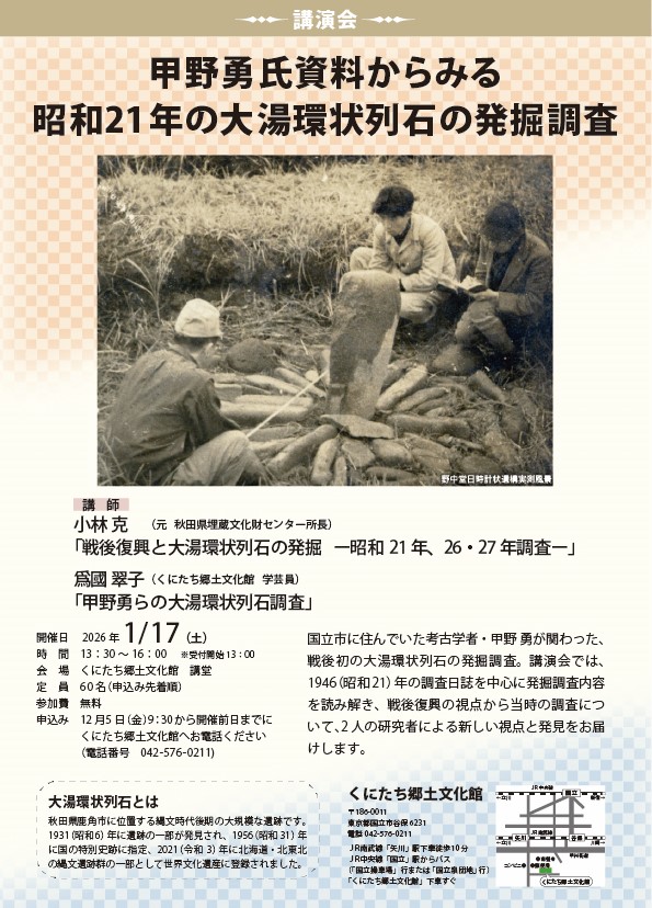 国立市に住んでいた考古学者・甲野 勇(こうの いさむ)が関わった、戦後初の大湯環状列石(おおゆかんじょうれっせき)の発掘調査。講演会では、昭和21年の調査日誌を中心に発掘調査内容を読み解き、戦後復興の視点から当時の調査について、2人の研究者による新しい視点と発見をお届けします。