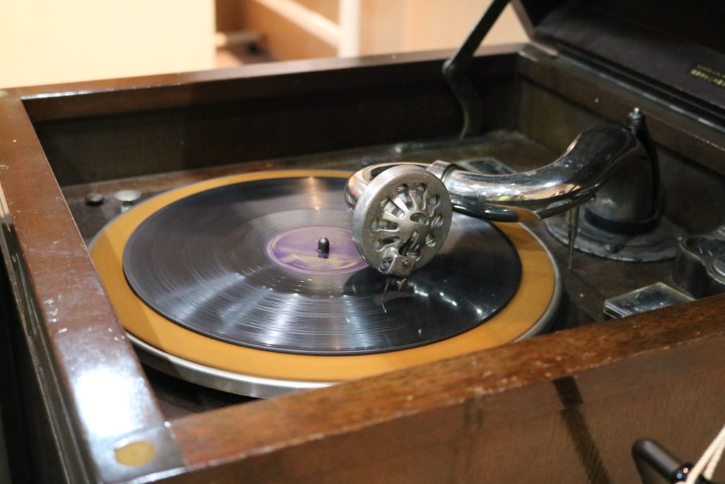 昭和初期の蓄音機を使って、SPレコ―ドの音楽を鑑賞します。