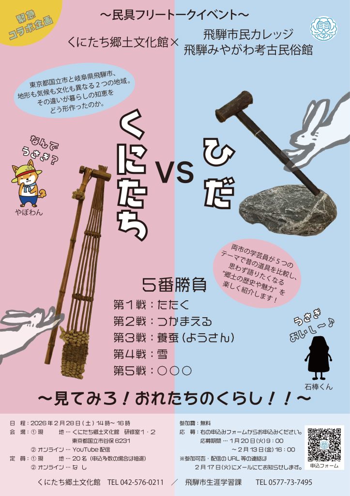 国立市と岐阜県飛騨市、地形も気候も文化も異なる2つの地域。その違いが暮らしの知恵をどう形づくったのか。両市の学芸員が5つのテーマで民具を比較し、思わず語りたくなる“郷土の歴史や魅力” を楽しく紹介します!